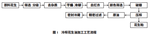 原料花生:將原料花生果首先采用剝殼機去殼; 篩選分級:脫殼后的花生仁通過初清篩、分級等過程。 去雜質:挑除花生仁中的石子、碎殼、灰塵等雜質; 干燥、冷卻:將脫殼后的花生放入低溫干燥烘箱進行 烘干,然后進行風冷處理;去紅衣:烘干后的花生仁迅 速進入風冷并去除紅衣;顏色篩選:去除黃斑、霉變、蟲蛀及未完全脫紅衣的花生;破瓣后壓榨:將脫紅衣后 的花生破瓣調節水分后送入壓榨機中進行壓榨;原油 過濾:冷榨毛油經過濾得到純凈的冷榨花生油;密封 冷藏:過濾后的花生油經過密封后冷藏,待檢測。