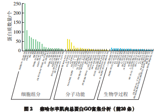 以UniProt/Swiss-Prot蛋白數(shù)據(jù)庫(kù)為背景,對(duì)總蛋白 進(jìn)行鑒定,初步建立察哈爾羊蛋白質(zhì)表達(dá)譜。由圖1可 知,1%假陽(yáng)性條件下,背最長(zhǎng)肌和臀肌中共檢測(cè)到蛋白 質(zhì)1 073 個(gè),其中背最長(zhǎng)肌中共檢測(cè)到877 個(gè),臀肌中共 檢測(cè)到897 個(gè),2 個(gè)部位的總蛋白數(shù)量相近。對(duì)察哈爾羊肌肉總蛋白進(jìn)行GO組分富集分析,由 圖2可知:在細(xì)胞組分中,富集于細(xì)胞外外泌體中的蛋白 質(zhì)數(shù)量最多,其次富集于細(xì)胞質(zhì)內(nèi)的蛋白質(zhì)數(shù)量較多; 在分子功能中,蛋白質(zhì)主要參與聚RNA結(jié)合、ATP結(jié)合 和鈣離子結(jié)合等功能;在生物學(xué)過(guò)程中,蛋白質(zhì)主要參 與三羧酸循環(huán)、蛋白質(zhì)結(jié)合和細(xì)胞氧化還原穩(wěn)態(tài)等生物 學(xué)過(guò)程。
